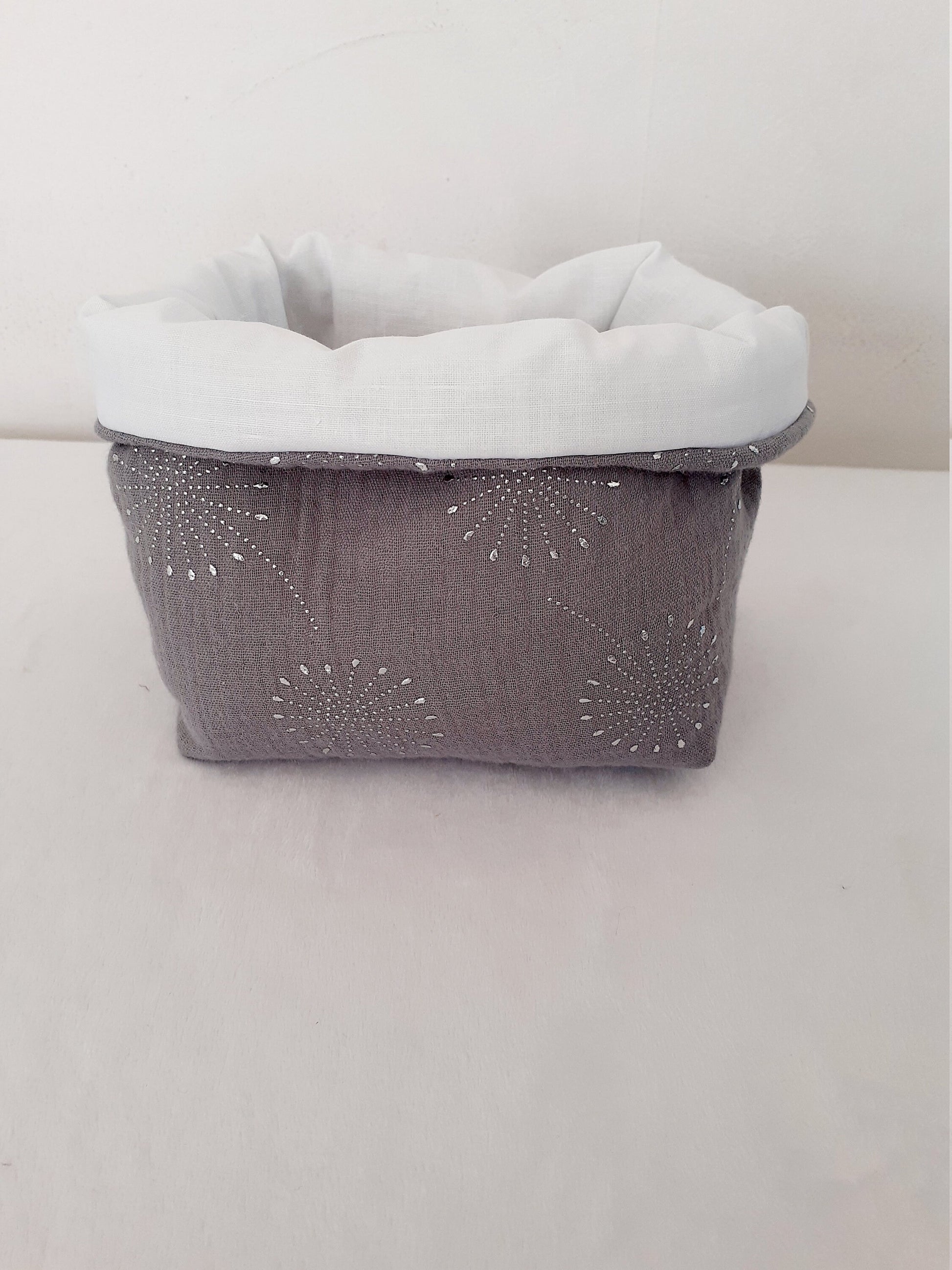 Réalisé en coton double gaze grise et fleurs en perles argentées, et un coton blanc uni pour l'intérieur du panier.