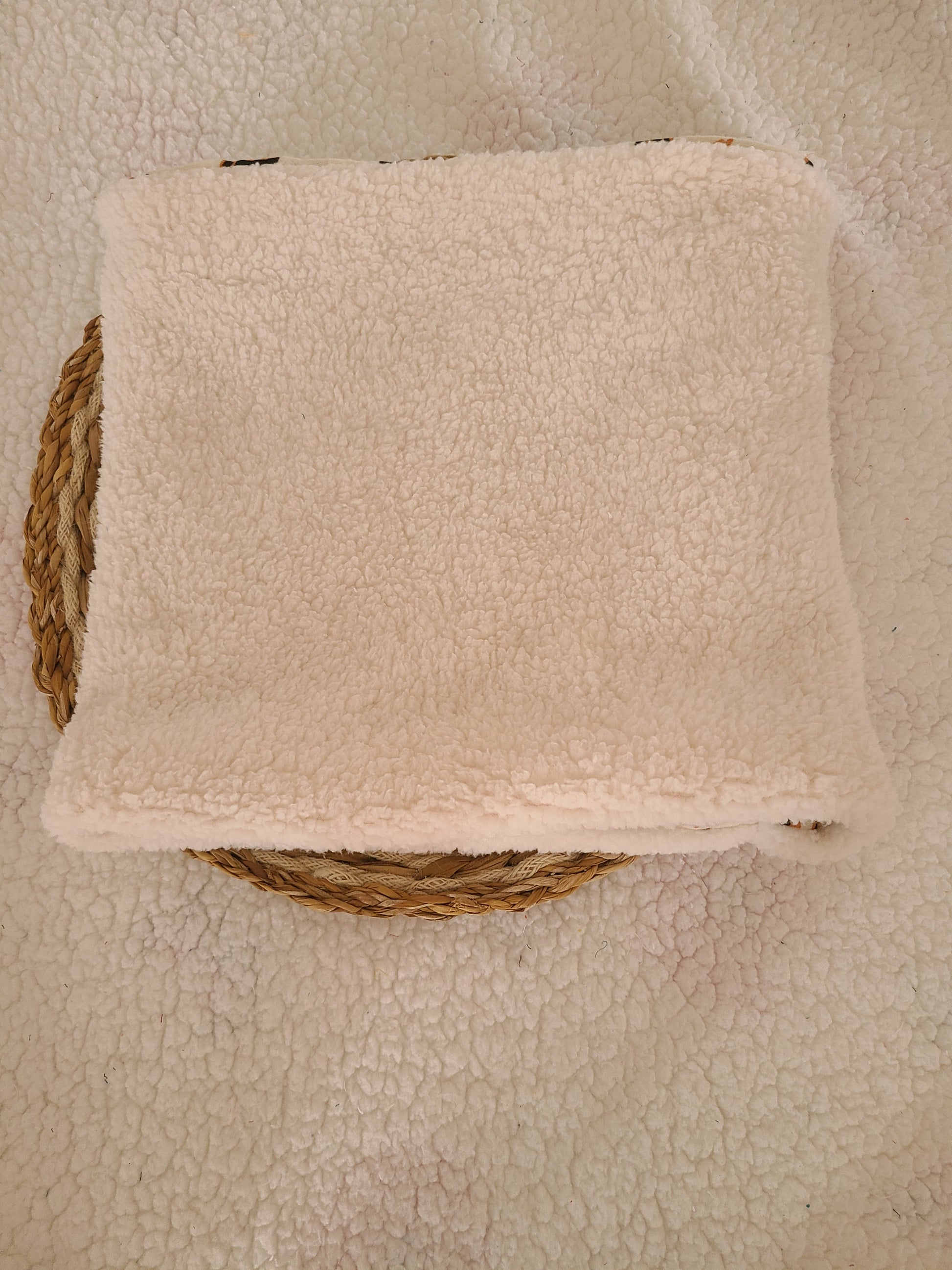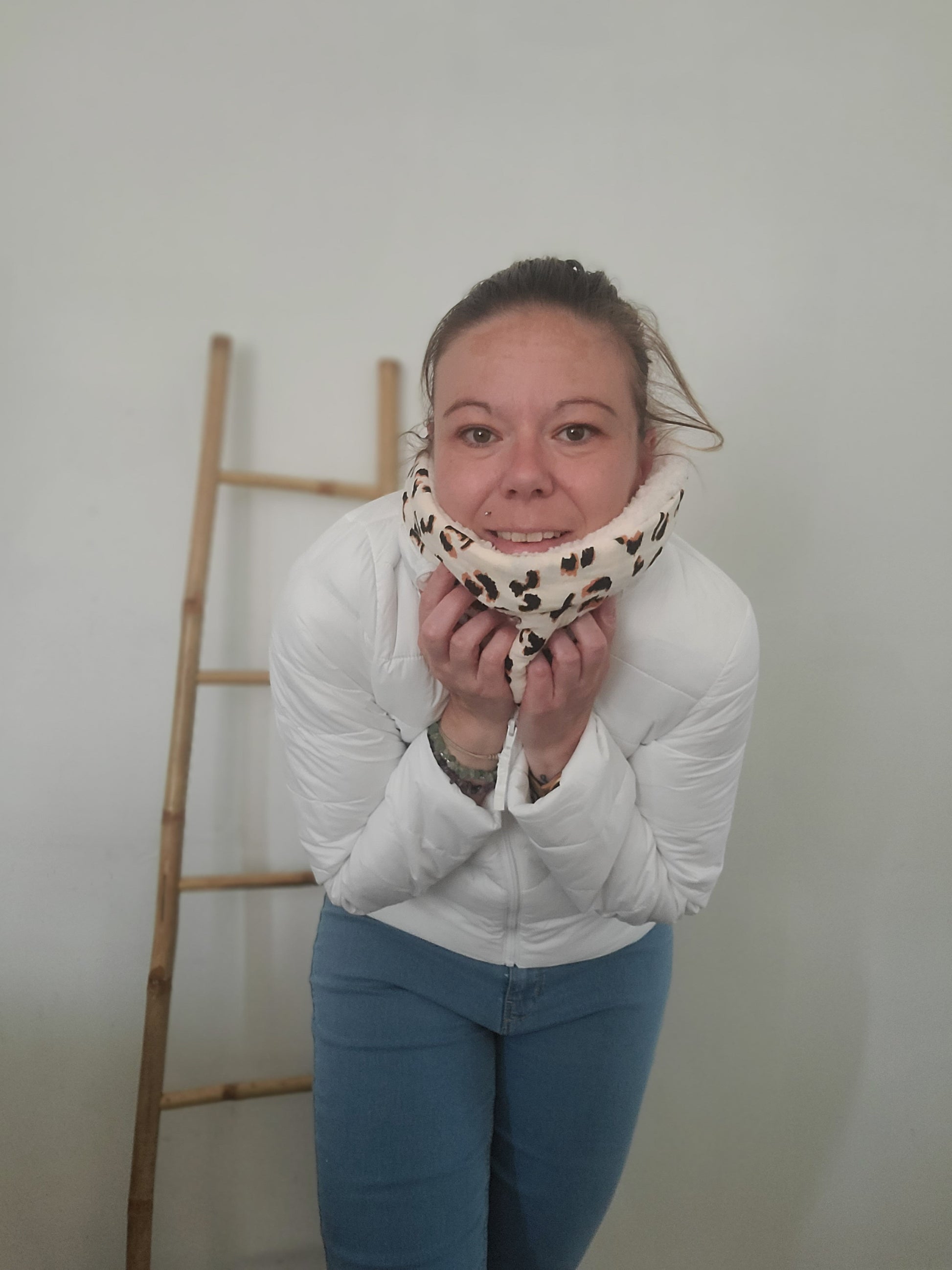 Le snood est réalisé avec une double gaze imprimé léopard d'un côté, d un sherpa couleur écrue de l autre côté.